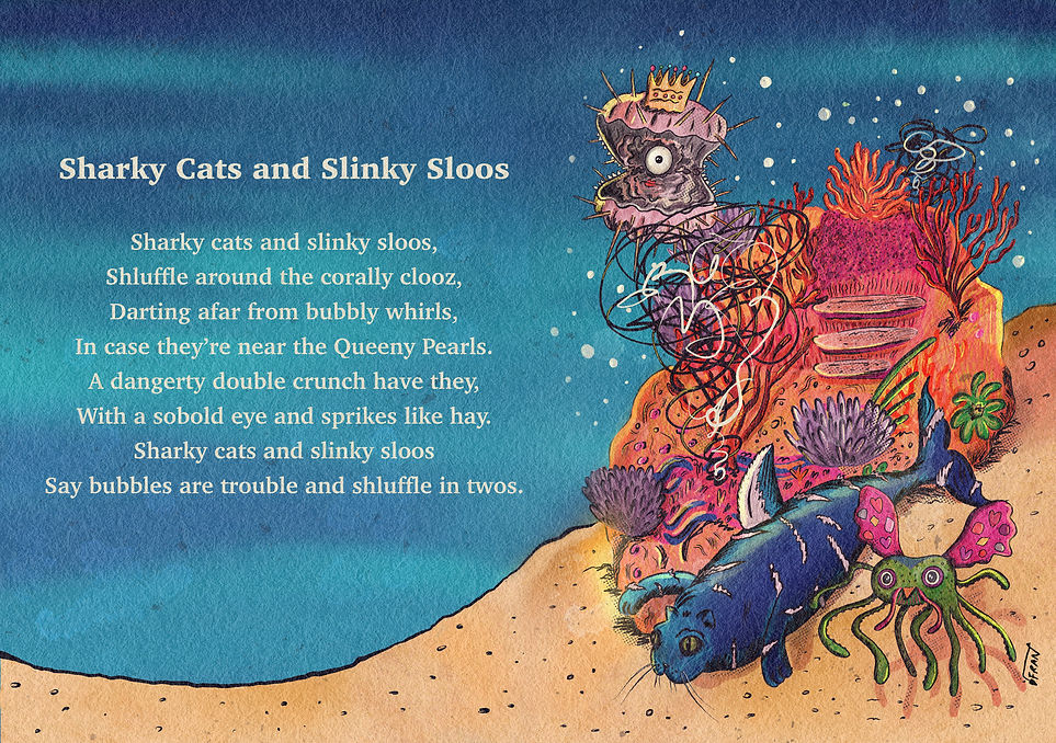 One of my ultimate goals is to become a children's author and illustrator. I created the Sharky Cats and Slinky Sloos poem and artwork for my illustration degree coursework. We were tasked with being inspired by, or writing our own, nonsense poem, like Lewis Carroll's Jabberwocky. I decided to write mine and then set about creating the characters. I absolutely loved working on this project and in the future hope to create a whole book based around nonsense poems and world building, it is definitely one of the most exciting projects I've ever worked on and I was delighted with the result (as was my tutor, which made me even more pleased with the outcome).